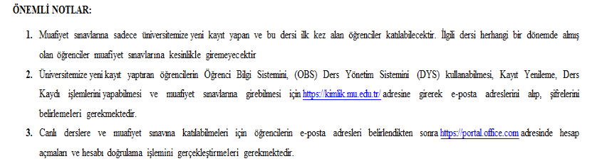 Önemli Not : Üniversitemize kayıt yaptıran öğrencilerin Öğrenci Bilgi Sistemini, (OBS) Ders Yönetim Sistemini (DYS) kullanabilmesi, Kayıt Yenileme ve Ders Kayıtlarını yapabilmesi ve muafiyet sınavlarına girebilmesi için