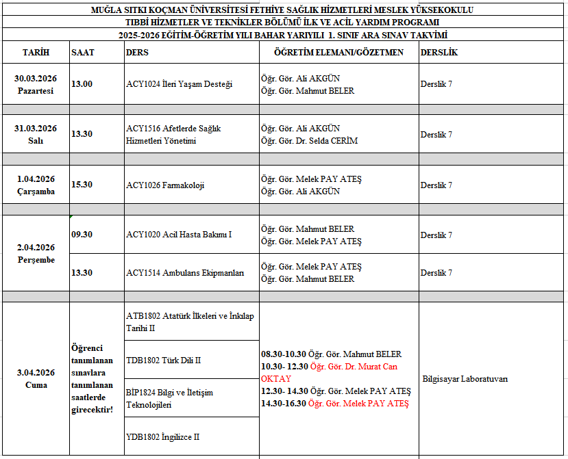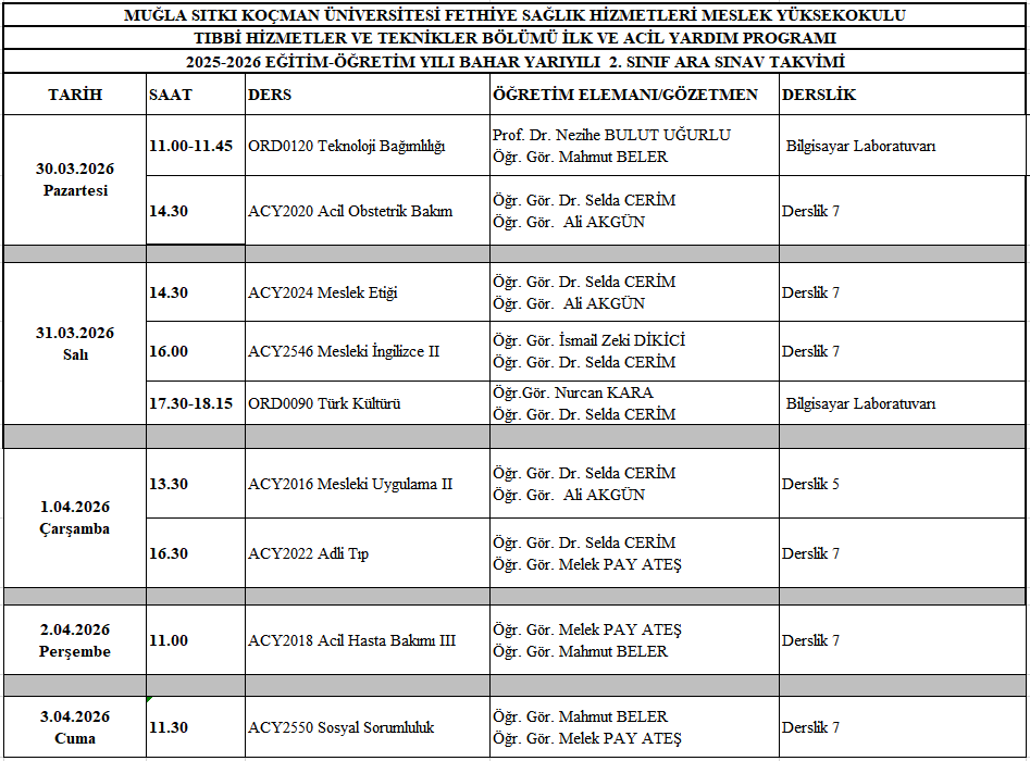 2025-2026 EĞİTİM ÖĞRETİM YILI BAHAR YARIYILI ARA SINAV TAKVİMİ Uzaktan Eğitim Verilen Derslerin Sınavları İçin Öğrencilerimiz Sınav yer ve saatlerini http://sinavduyuru.mu.edu.tr/ adresinden öğrenci numaralarını girererek öğrenebileceklerdir. Son Güncelleme : 25.03.2026 14:38 Okunma Sayısı : 746