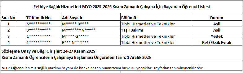 KISMİ ZAMANLI ÇALIŞMA ÖĞRENCİ BAŞVURU SONUÇLARI