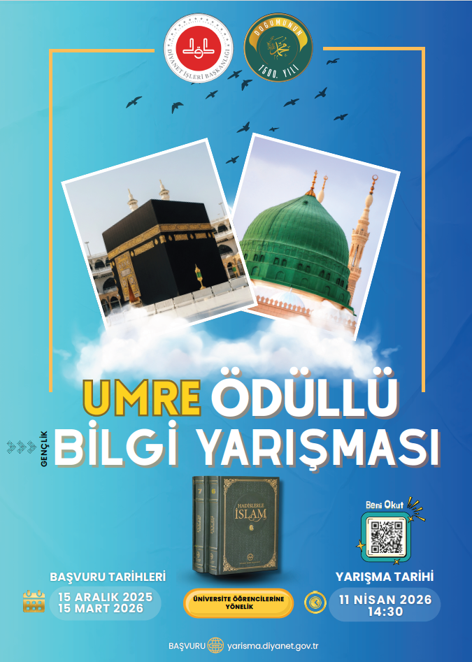 1- 2026 Yılı Umre Ödüllü Gençlik Bilgi Yarışması, Mevlidi Nebi Haftası “Doğumunun 1500. Yılında Alemlere Rahmet Hz. Muhammed (s.a.s)” teması çerçevesinde gerçekleştirilecektir.